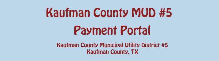 Please call 469-377-1656 for assistance.************************************************************* Republic Services implements new trash schedule July 10, 2023. Online Payments are now available.The Kaufman County Municipal Utility District #5 is a non-profit cooperative established and operated under the jurisdiction of the Texas Department of Health, the Farmers Home Administration, the Texas Commission on Environmental Quality and the United States Environmental Protection Agency. Our mission is to provide essential utilities such as sewage treatment, trash pickup and disposal, and property management of sub-divisions. As a service to our customers we have made available a method for online payment by credit card of the monthly usage fee that you receive included in your water bill. Please remember, the monthly fees for water and MUD are listed separately and the payments must continue to be made separately to the individual service providing agency. This payment portal is strictly for payment of Kaufman County MUD#5 fees. Online Payment Information (pdf)